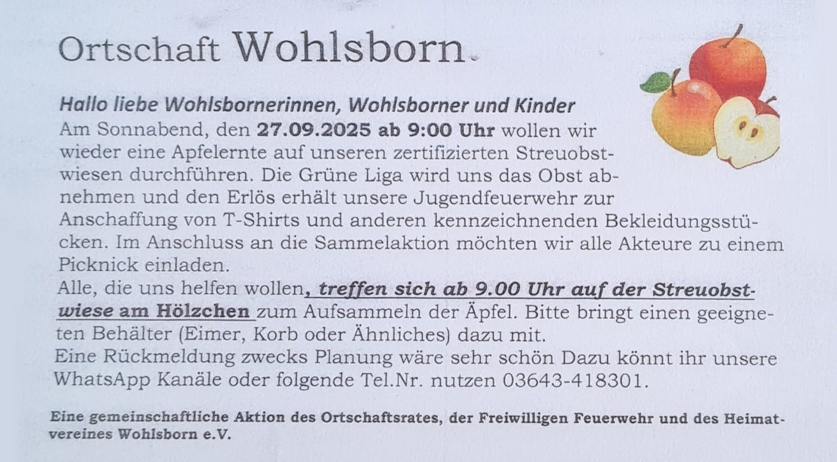 Nach dem die Idee geboren war, im Heimatverein abgestimmt war und die Absprachen mit der Grünen Liga zur Abnahme und Verwertung der Äpfel getroffen waren, wurden 120 Einladungen in Wohlsborn verteilt: